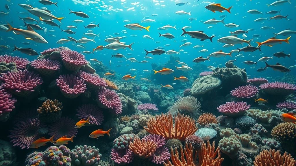 A hyperrealistic image of a vibrant coral reef filled with colorful fish and reef sharks. The image is highly detailed with a cinematic and atmospheric aesthetic.