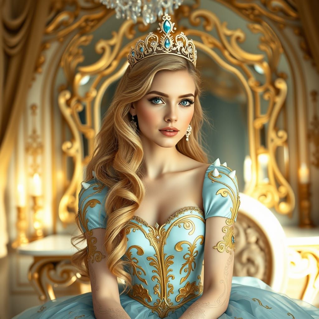 This image shows a beautiful princess in a lavish bedroom, surrounded by ornate details and soft lighting, wearing a stunning tiara and elegant dress in a fusion of Art Nouveau and futuristic luxury styles.