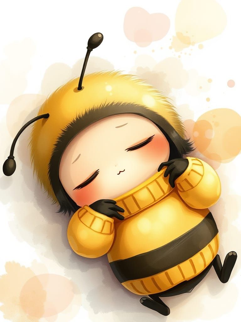 This image shows a cute, sleepy anime bumblebee in watercolor splash art style. The artwork features vibrant colors and a playful aesthetic.