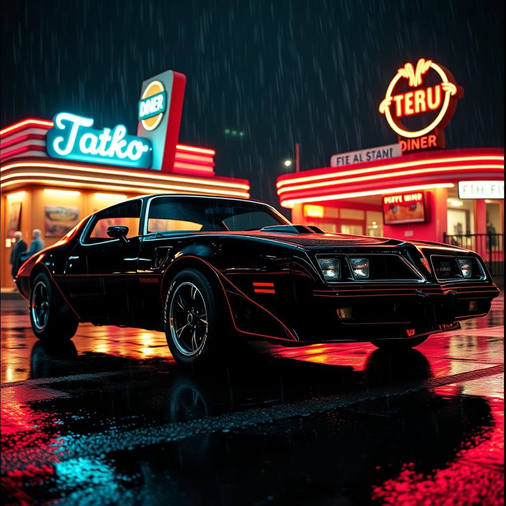 This image shows a black 1970s Trans Am parked at a retro diner on a rainy night. The neon lights reflect off the car in a dark, cinematic aesthetic.
