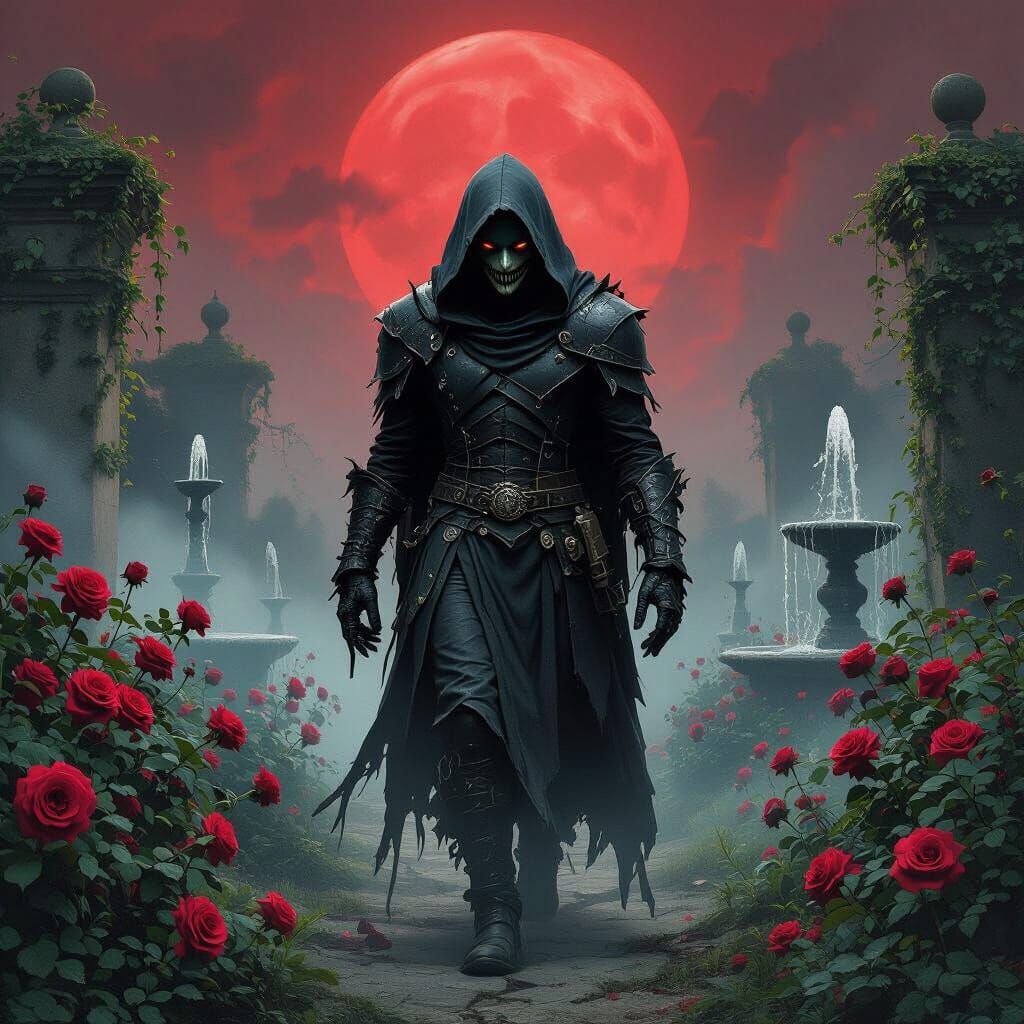 This image shows a bizarre, cloaked, tentacled figure in worn armor emerging from a misty rose garden beneath a crimson moon. The artwork features dark, gothic, biomechanical elements.