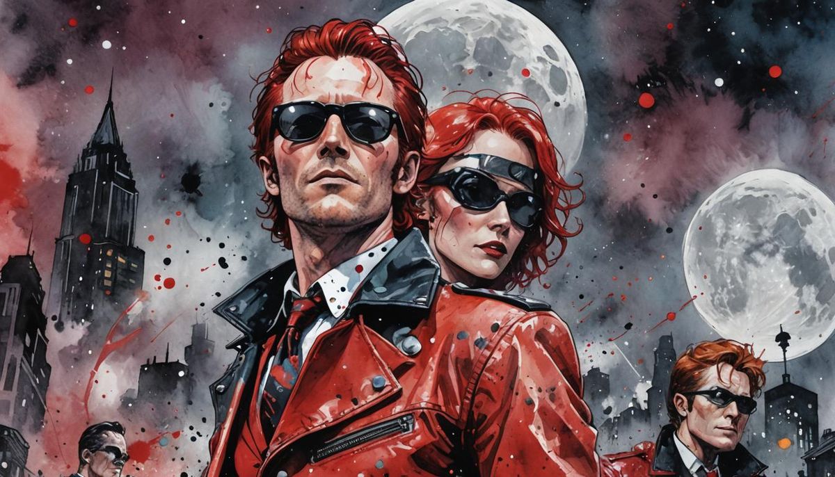 A striking image of a man with red hair in a red leather jacket, tie, and sunglasses, set against a Gotham-style backdrop. Rendered as DC comic book art with watercolor and acrylic textures.