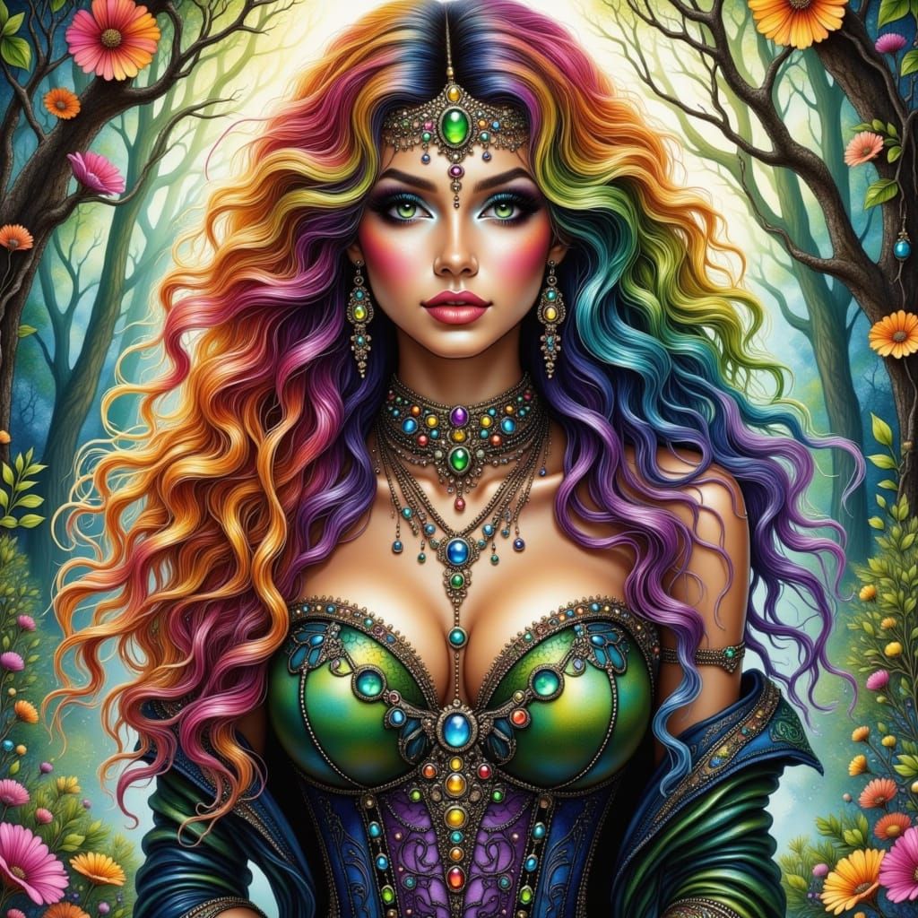 A hyperrealistic close-up of Lilith Lailah with flowing rainbow hair, emerald eyes, and gothic attire. Features ethereal glow and cinematic lighting in a watercolor fusion landscape.