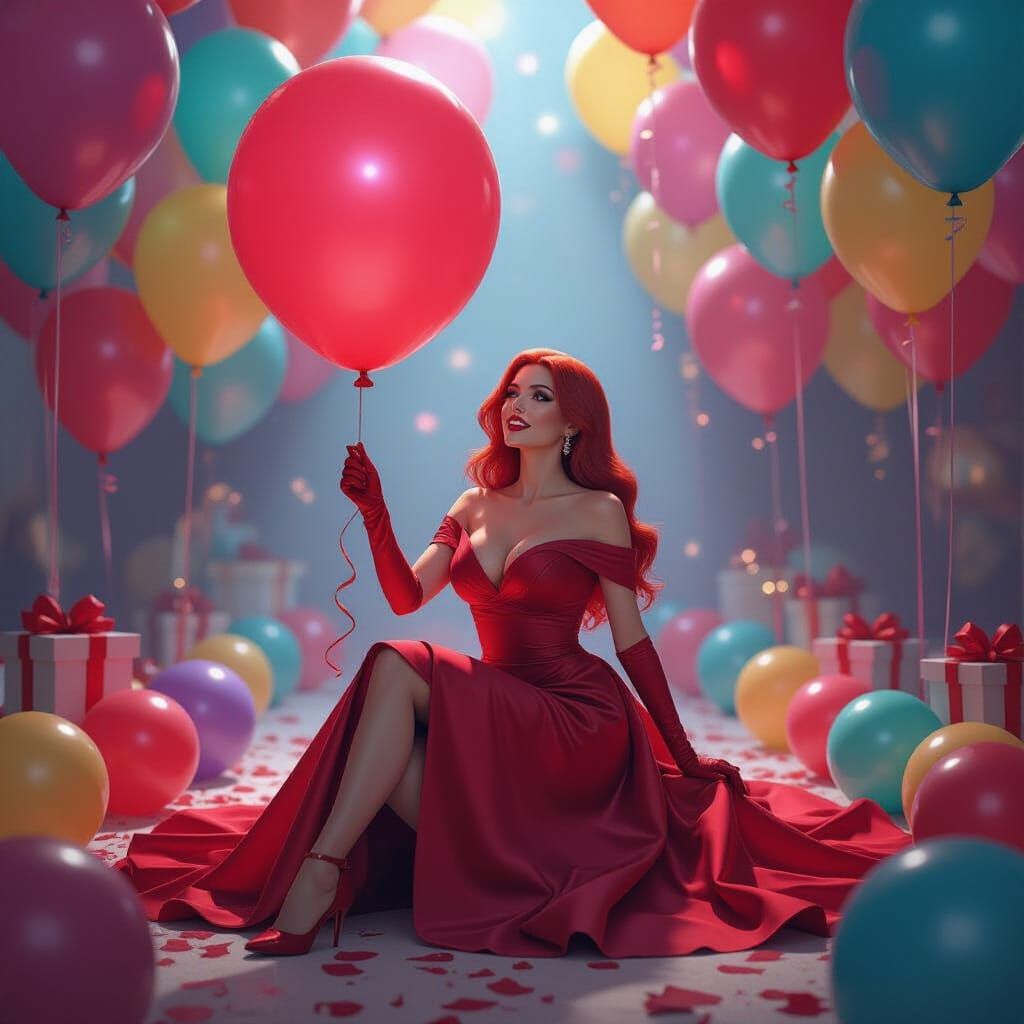 This image shows Scarlet Witch in a red dress, seated in a festive scene. She is popping a large birthday balloon, surrounded by many colorful balloons, in a fantastical digital art style.