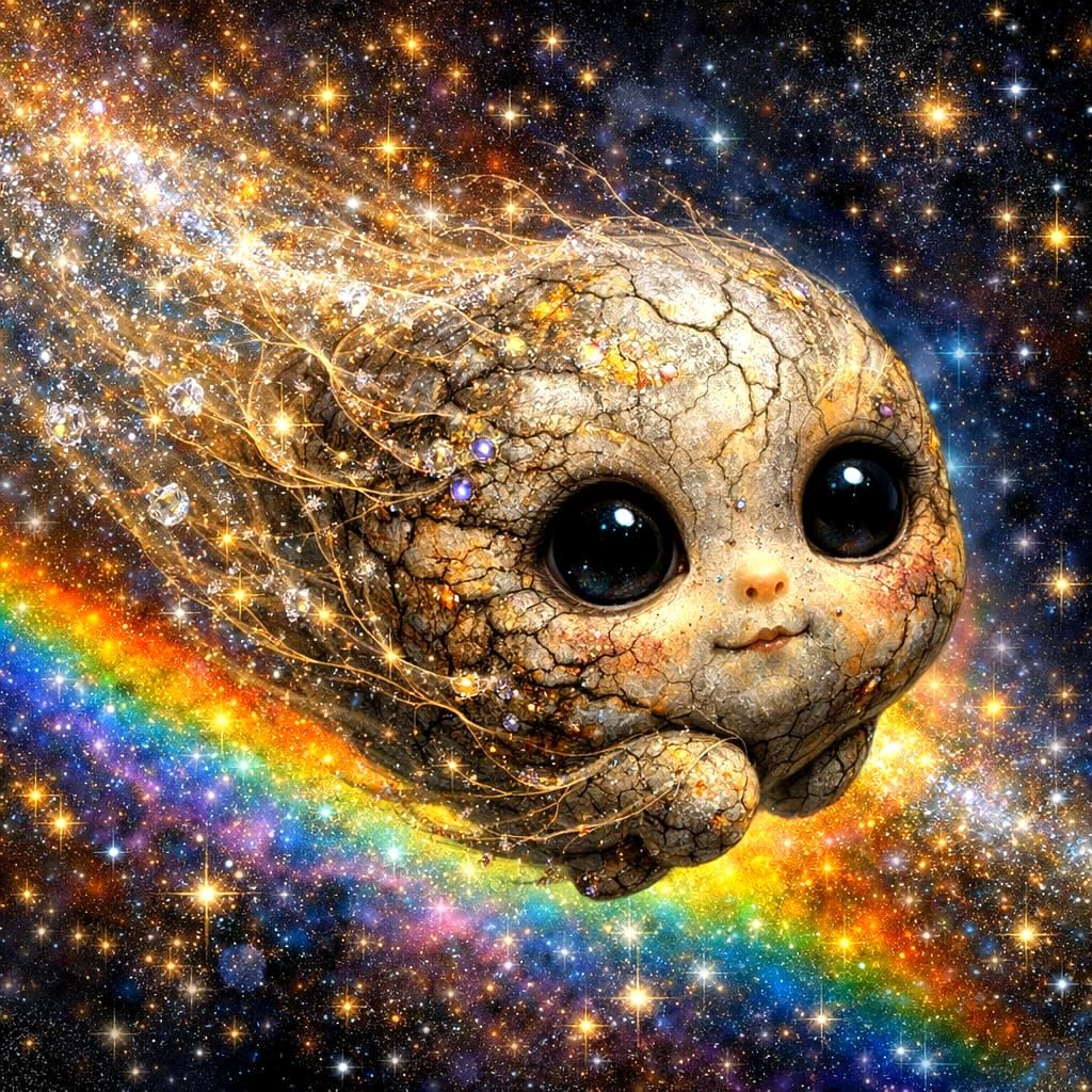 This image showcases an exquisitely beautiful, photorealistic baby comet with large, expressive eyes, rendered with intricate, stone-like details and flowing tendrils against a sparkling cosmic backdrop.