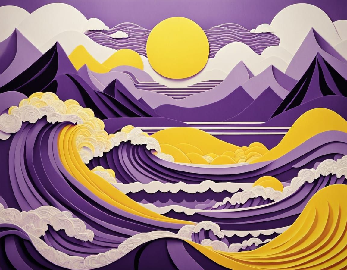 This image showcases a stunning retro-style landscape featuring intricate waves in shades of purple and yellow, crafted with delicate paper cut details.