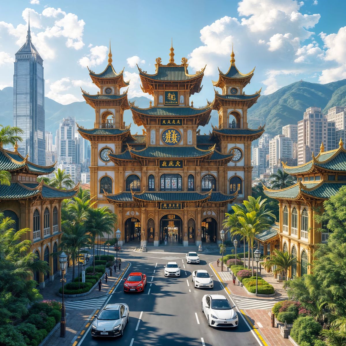 A breathtaking digital artwork of the majestic Holy Cathedral of Santo Nome do Deus do Macau in a solarpunk Macao.