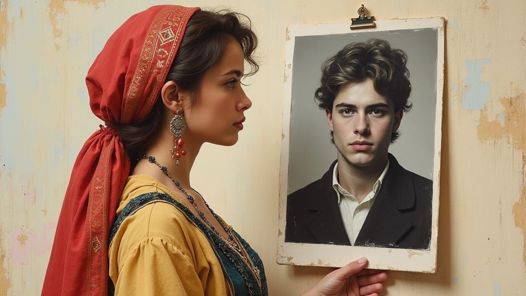 This image portrays a sorrowful Myriam in period Arab dress, gazing at a black and white photo of Rimbaud. The oil painting is rendered with vivid pastel colors, soft lighting, and fine brushstrokes reminiscent of Post-Impressionism.