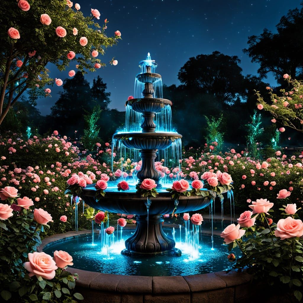 This image shows a garden of roses with bioluminescent flora surrounding a beautiful fountain. The flora illuminates the scene, creating a magical and ethereal atmosphere.