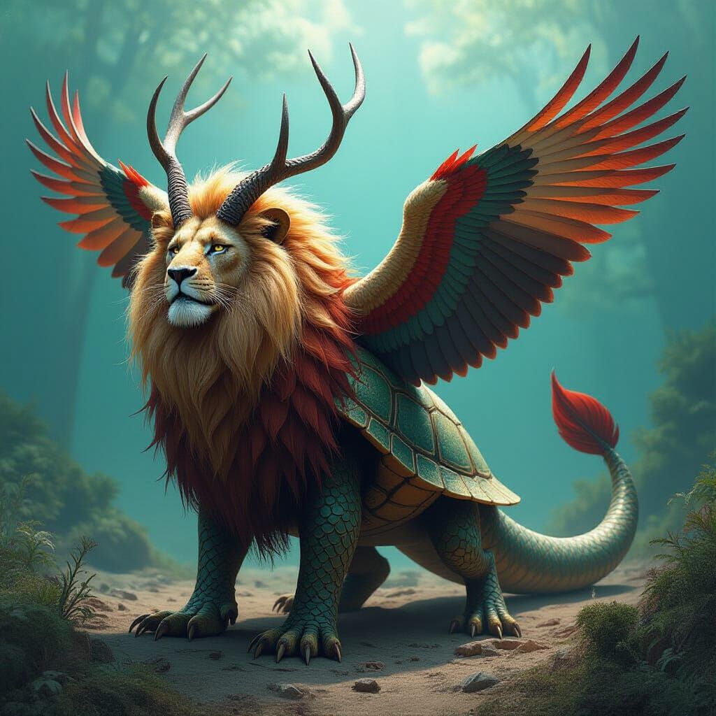 This surreal image showcases a fantastical hybrid creature with a lion's mane, eagle wings, serpent tail, turtle shell, antelope antlers, and fish scales in a vibrant, otherworldly landscape.