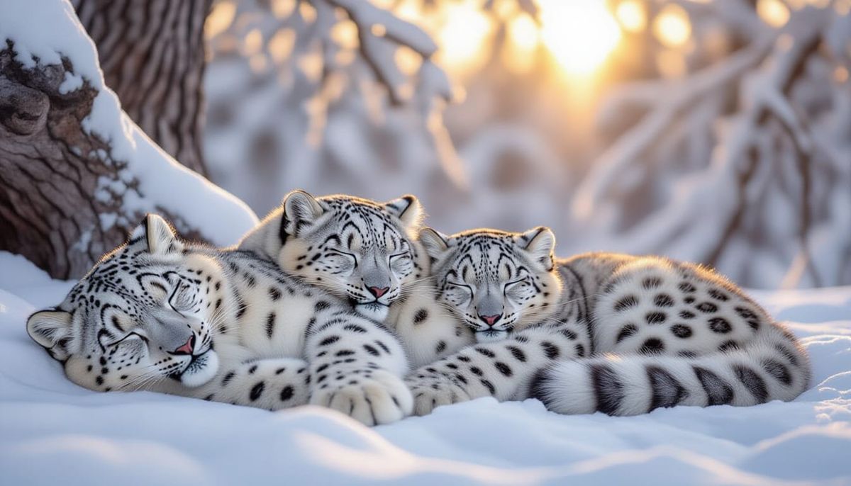 This professional photograph captures three incredibly cute snow leopards sleeping soundly in a snowy forest. The image features intricate details, HDR, and god rays during sunset, creating a beautiful and splendid scene.
