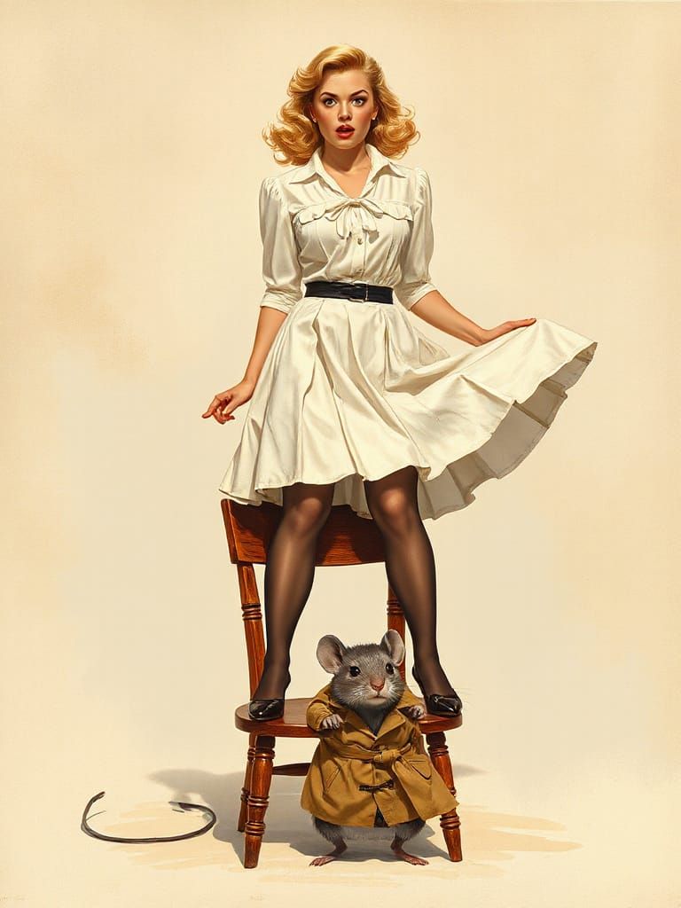 This image shows a vintage pin-up style illustration of a blonde woman terrified of a trenchcoat-wearing mouse. The artwork evokes classic 1950s calendar art with retro colors and a playful, glamorous aesthetic.