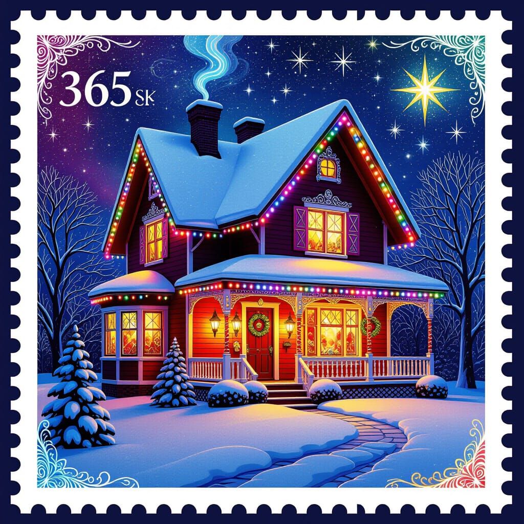 This image shows a Christmas house aglow with lights and decorations, depicted on a $365 postage stamp. The artwork features holographic and astral cosmic elements in a mixed media style, evoking visionary art.