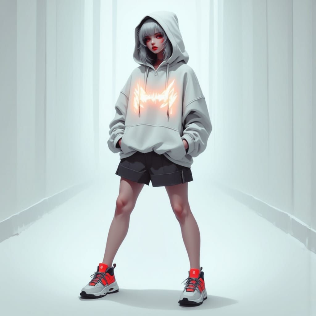 This image shows a young woman in a white studio, sporting futuristic attire with neon logos. The artwork features cinematic lighting and smooth gradients, rendered as hyper-detailed digital art.