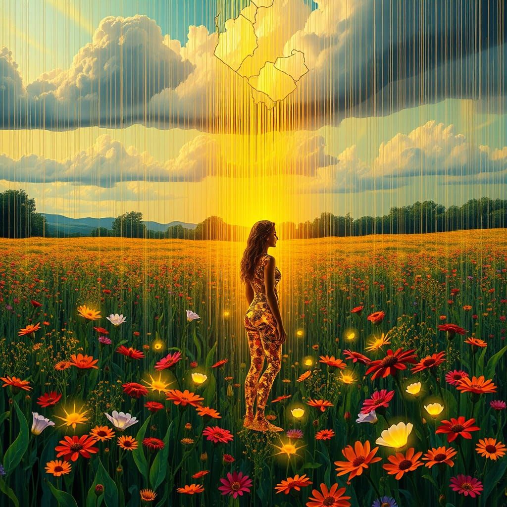 A serene scene of a figure in a wildflower field, face upturned to illuminated rain under thunderous clouds. Rendered with surreal and fantasy elements, the image features vibrant colors and intricate details.
