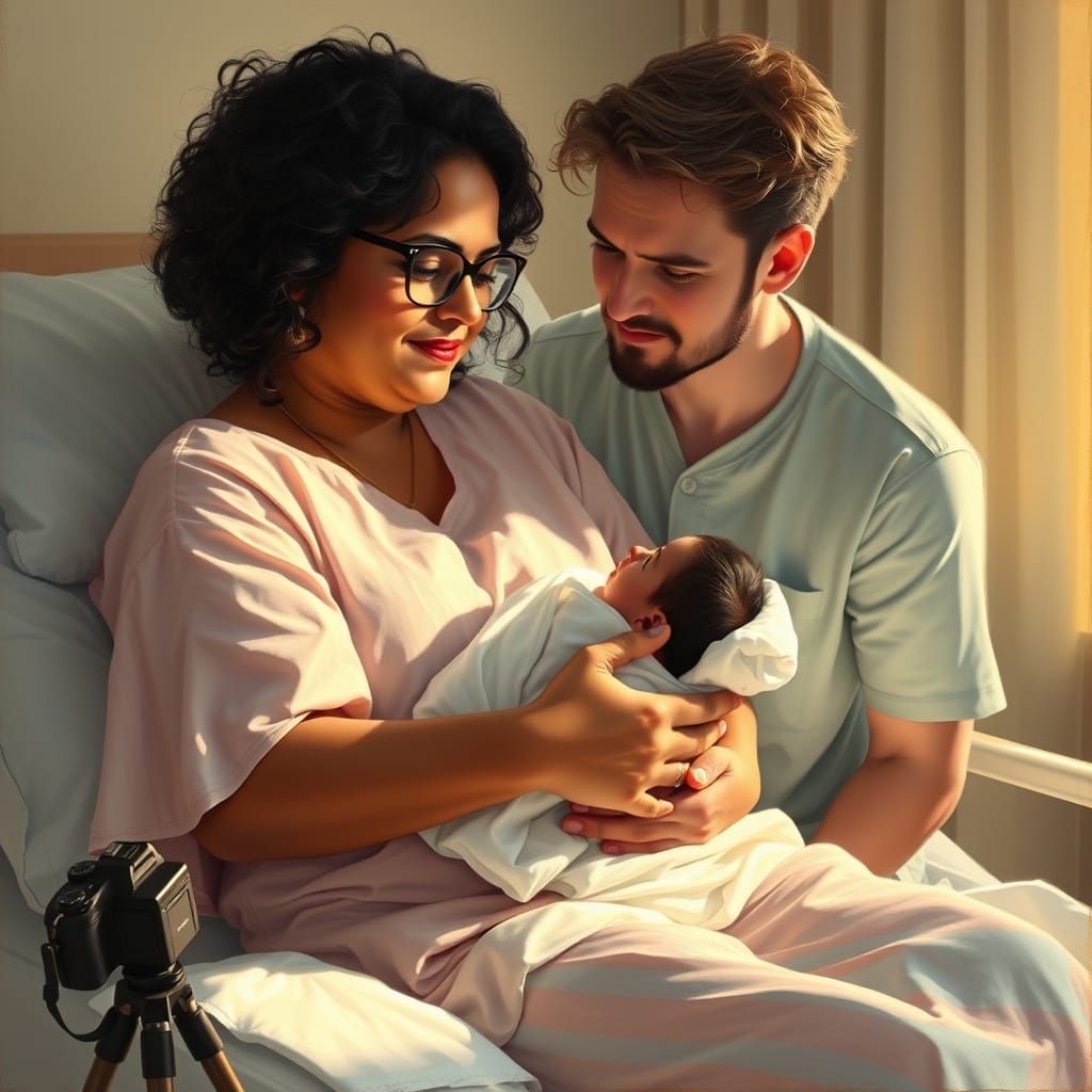 This image shows a new mother and father in a softly lit hospital room gazing adoringly at their newborn baby. The scene is filled with love and tenderness as the parents connect with their child.