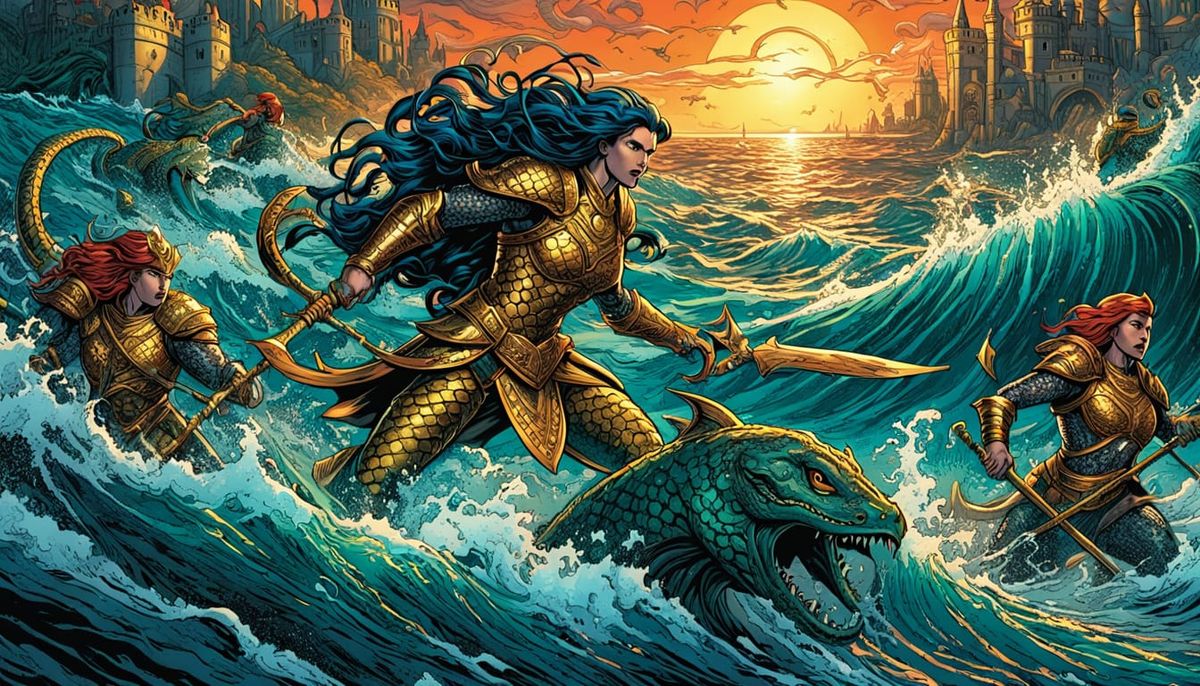 This image shows a dynamic underwater battle scene in a comic book style. Armored mermaid warriors, led by their queen, fight shadowy sea serpents amidst coral castles and magical flashes.