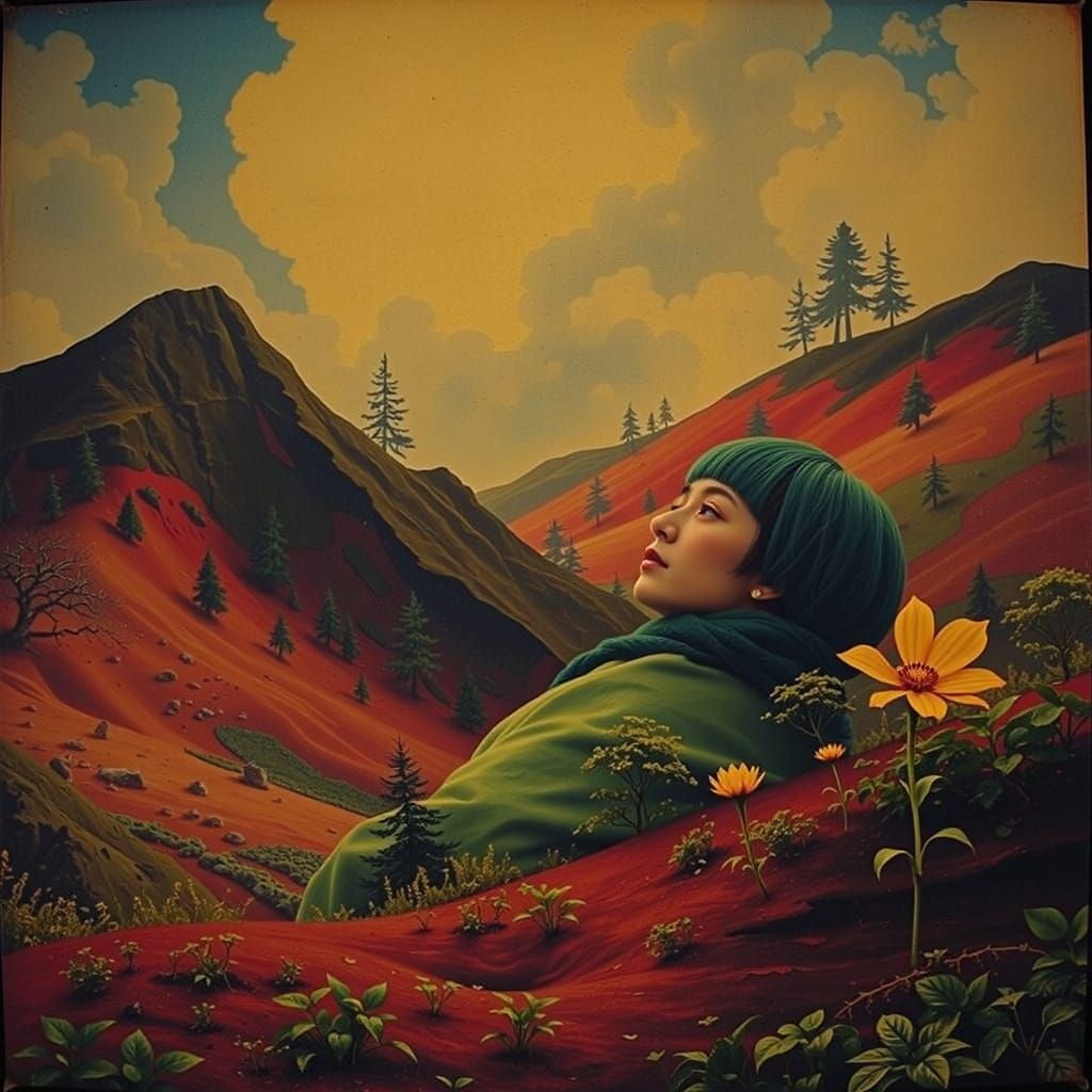 This photorealistic image depicts a dense, foggy forest scene with vibrant green leaves and a hyper-realistic blue sky. It incorporates a surreal blend of diverse figures and symbolic elements.