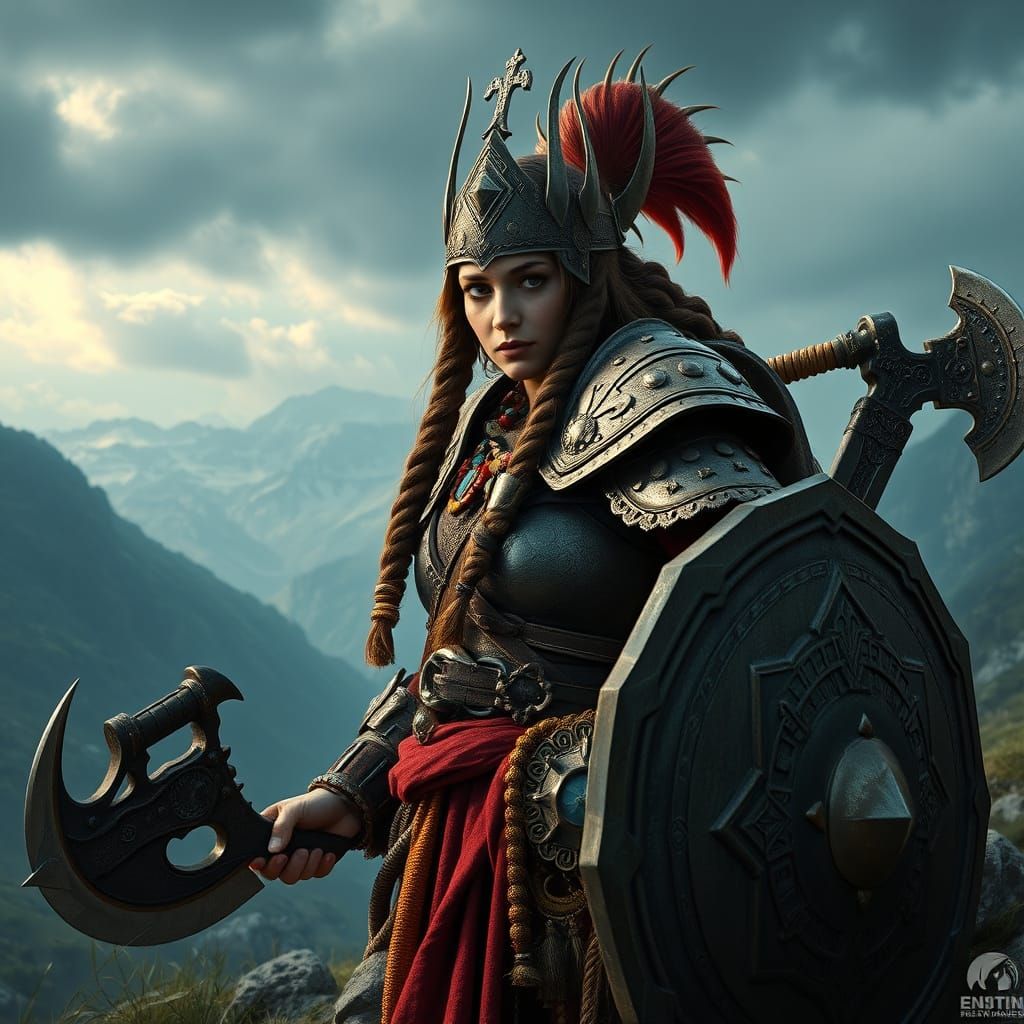 This image shows a powerful female hill dwarf cleric, adorned with intricate braids and vibrant jewellery, standing strong with her mace, axe, and shield, set against a dramatic backdrop reminiscent of cinematic fantasy art
