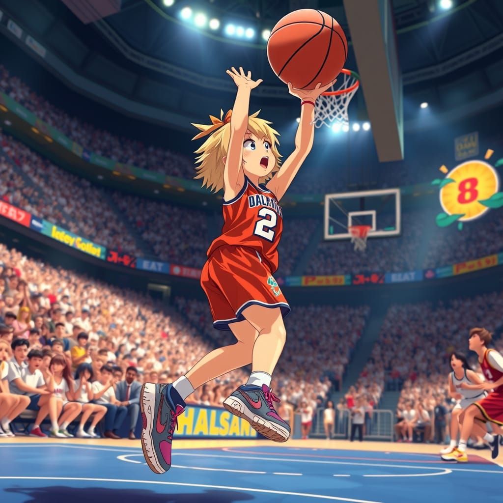 This image shows a curly blonde little girl basketball player in action. She's wearing a team jersey and sneakers, shooting a three-point basket in a stadium with an excited crowd, rendered in a 3D anime style.