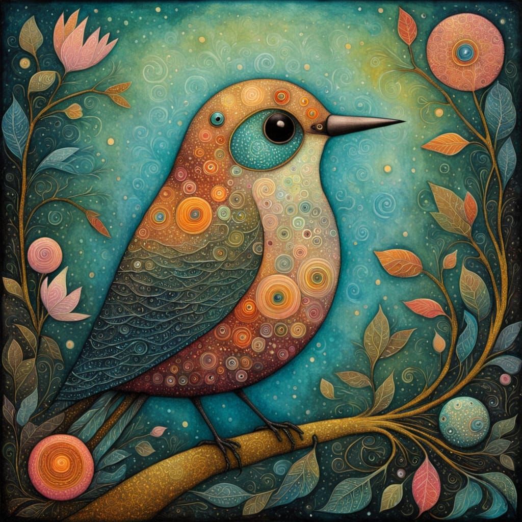 A delicate, intricate bird in a vibrant, dreamlike setting, rendered in the characteristic style of art brut art, with a focus on pastel colors and intricate details.