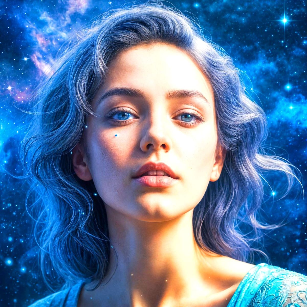 This image features a spectral young woman amidst swirling nebulae and stars, rendered with painterly textures. Deep shadows and dramatic lighting create a melancholic, atmospheric mood.