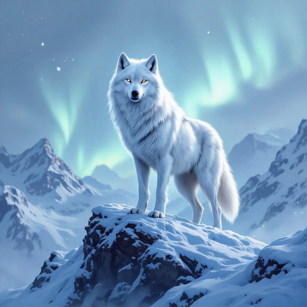 This image shows a white wolf with luminous eyes standing on a mountain peak covered in ice. The sky features swirling blues and grays with shimmering aurora borealis, realized as cinematic epic fantasy art.