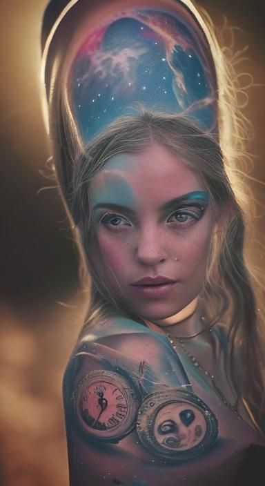 This image shows a tattooed goddess figure in a transparent dress, surrounded by a vibrant, colorful crowd. The artwork features tribal elements and a surreal, dreamlike quality.
