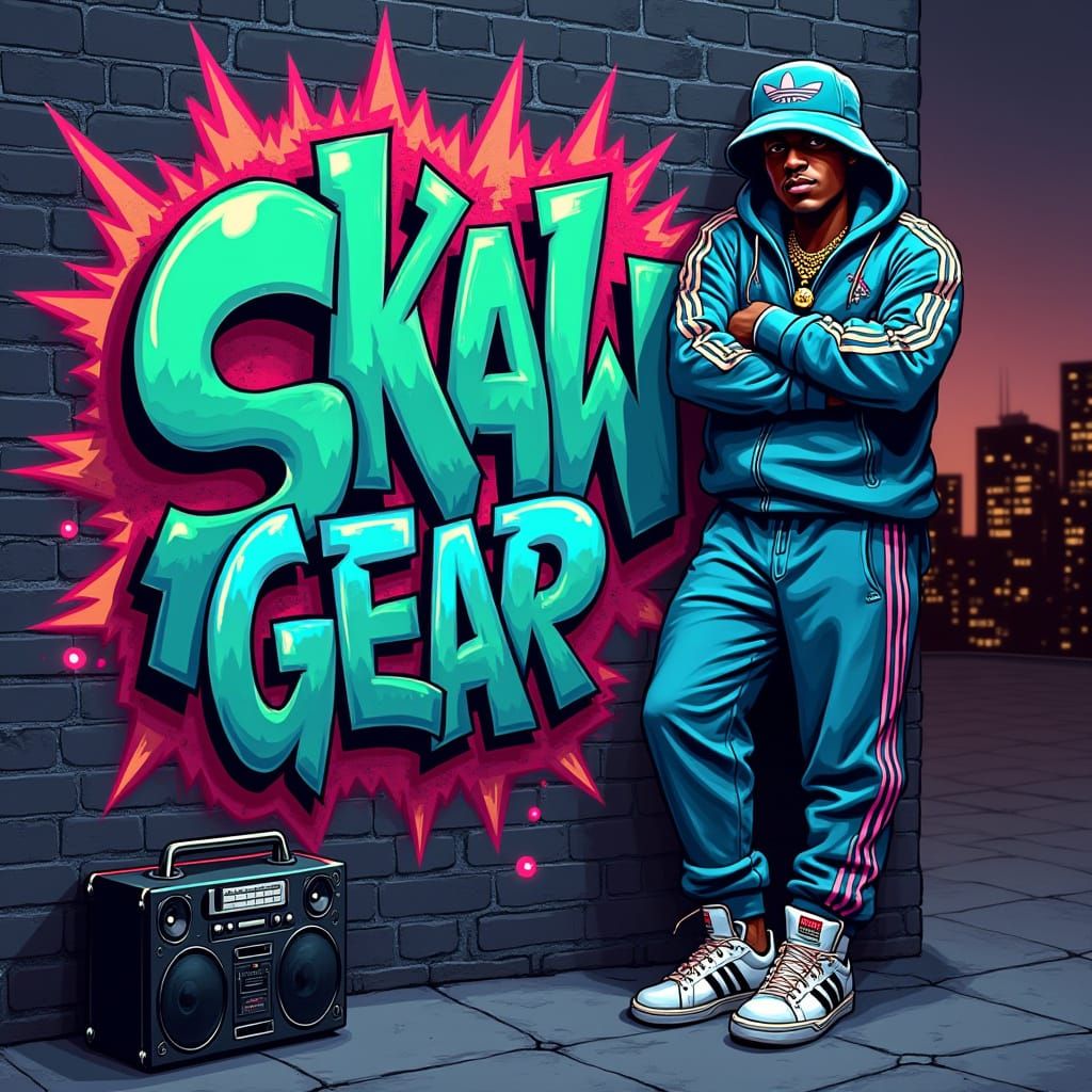 This dynamic graffiti artwork features interwoven, high-energy letters in electric blue, fiery red, and neon green, popping against a gritty brick wall background. A hip-hop homeboy leans confidently against the piece, evoking a classic 80s vibe, with a dark city skyline and neon-lit night sky in the bac...