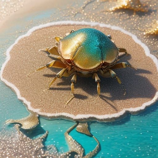 A vibrant oil painting of a baby playing with crabs on a golden sandy beach. Teal water sparkles under warm sunlight, reflecting golden light in this serene and peaceful scene.