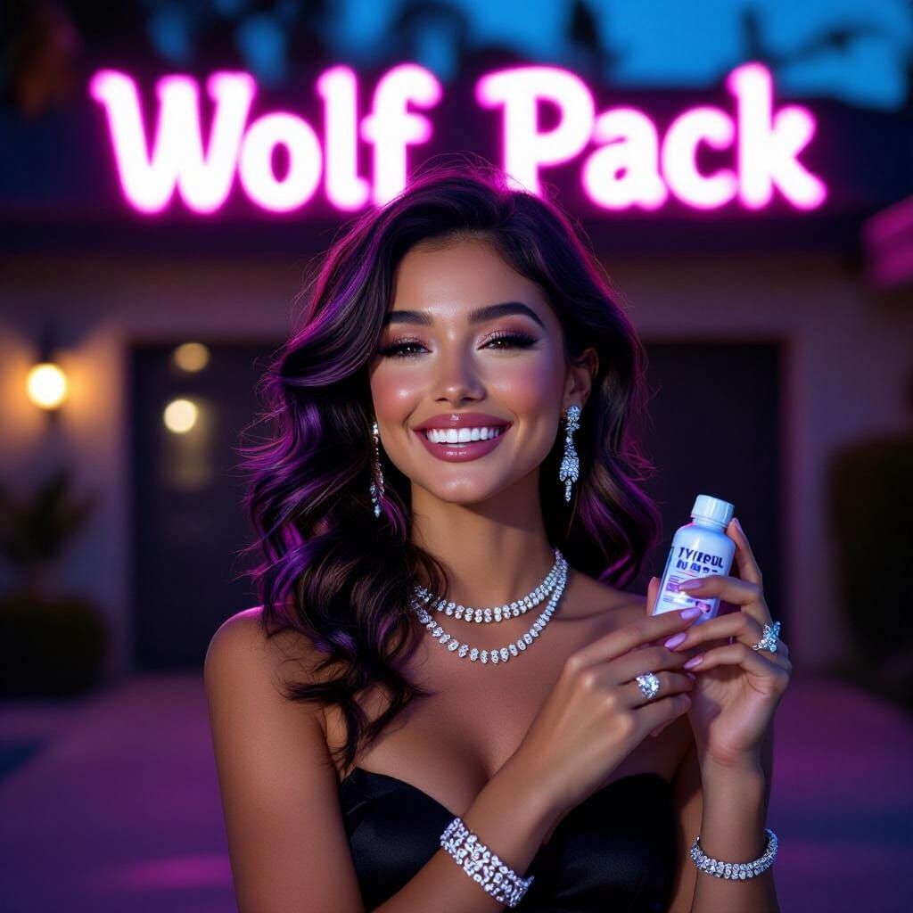 A beautiful young woman with purple-highlighted curly hair smiles, showcasing diamond jewelry. The image is in the style of glamorous fashion photography with rich colors and dramatic lighting.