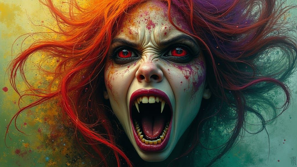 This image depicts a dark, mystical female elf with sharp teeth and piercing red eyes, her features twisted in a malevolent snarl. The artwork features vibrant, clashing colors and a 3D sheen, inspired by avant-garde styles and rendered in meticulous detail.