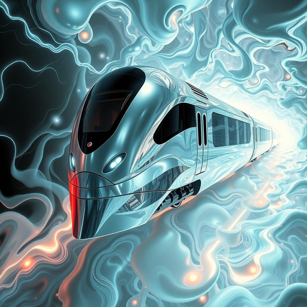 This image shows a futuristic train suspended within a shimmering 4D tesseract, surrounded by undulating waves of liquid-like human figures, in a cyberpunk aesthetic with bioluminescent tendrils casting an otherworldly glow.
