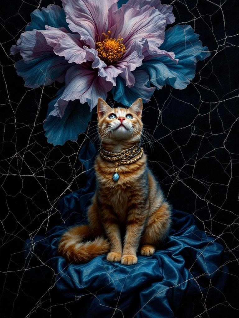A striking picture of a cat under a flower against a surreal background. This digital artwork blends hyperrealism with romantic elements using a color palette dominated by blues and purples.