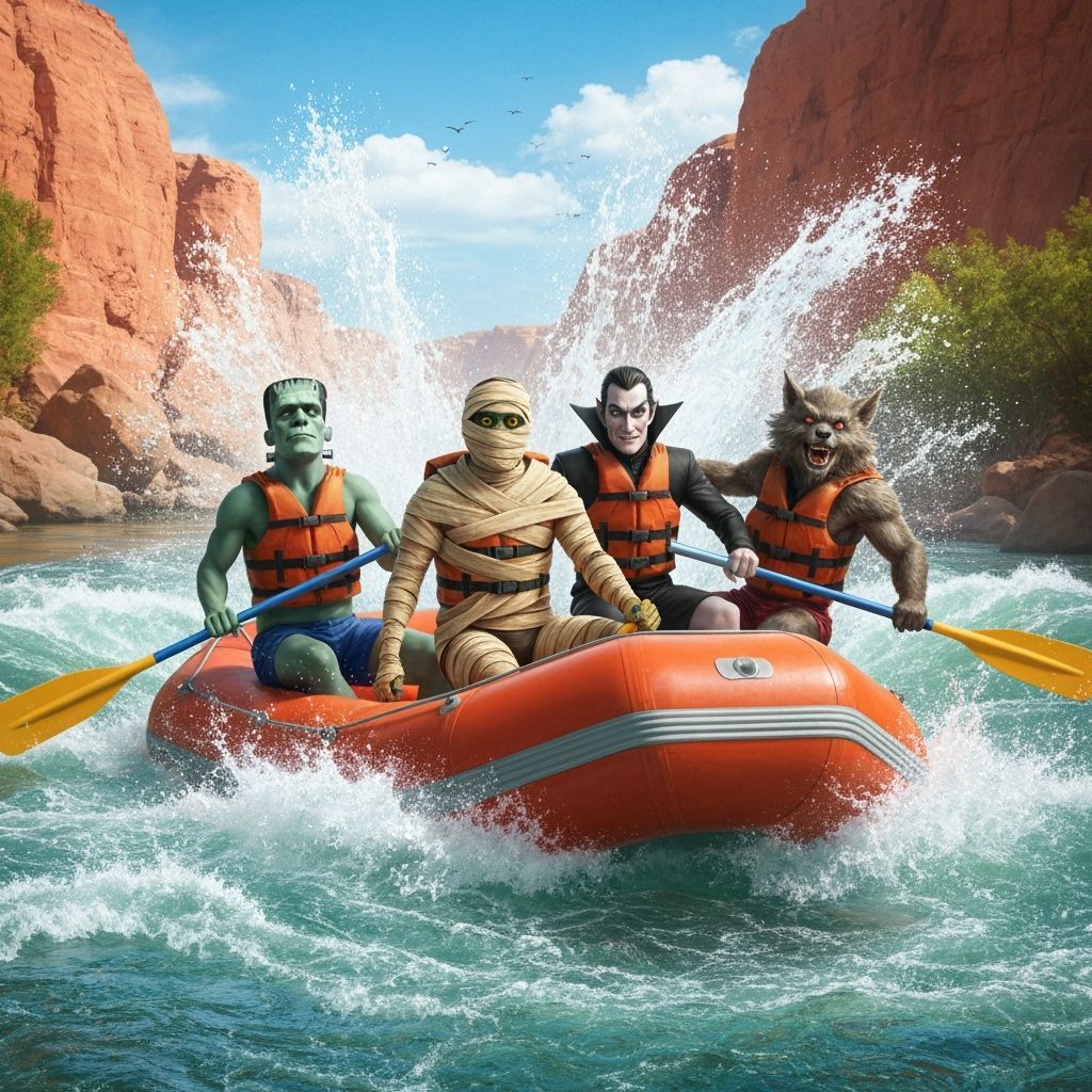 This image depicts famous monsters whitewater rafting on the Colorado River, enjoying a sunny day. Rendered as a detailed digital painting with dramatic lighting, it captures a fun, unexpected scene.