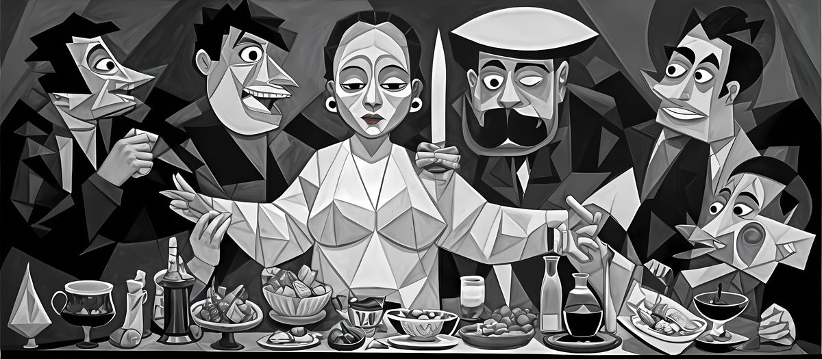 This colorful painting depicts a lively Latinx family reunion scene, inspired by the cubist masterpieces of Picasso. A grandmother sits at the center of the table, surrounded by lively relatives, a piñata, and traditional foods, all captured in a unique neo-cubist aesthetic with layered, overlapping geom...
