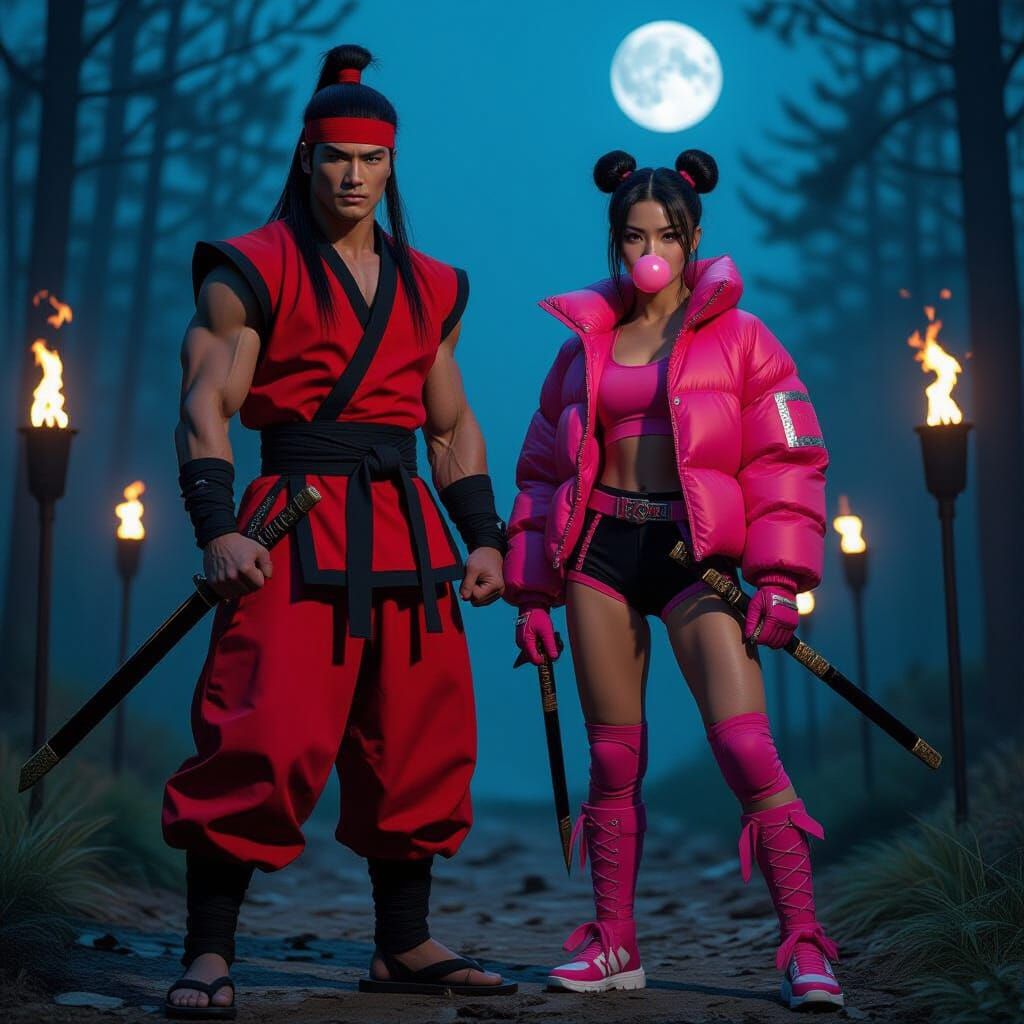 This image shows two warriors standing in a torch-lit forest under a full moon. The cinematic shot, with vibrant color grading and dramatic lighting, is reminiscent of a film still with a 35mm aesthetic.
