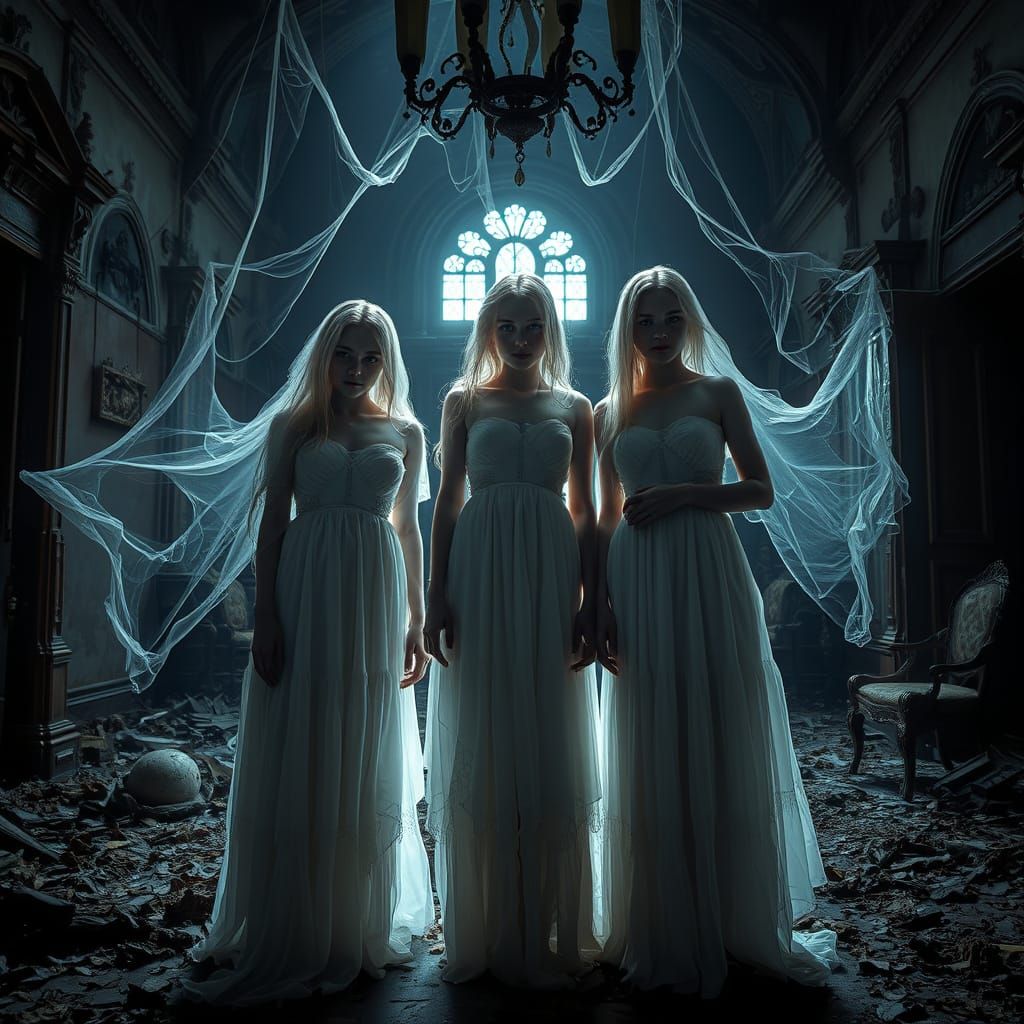 This image shows three ghostly figures in a dimly lit, abandoned mansion, surrounded by cobwebs and opulent decay, with intricate details and textures, evoking a cinematic, atmospheric quality reminiscent of Beksiลski's haunting visions.