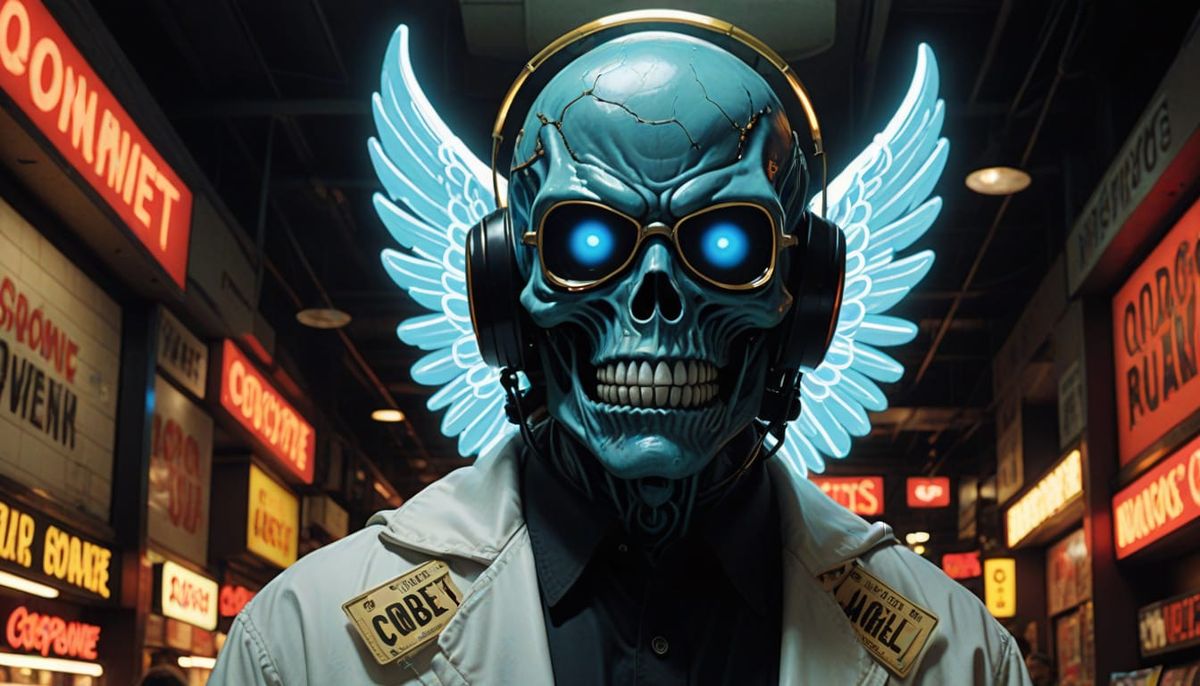 A surreal image shows a dystopian Christmas tree topper of an alien angel with a skull-like face and dollar-sign pupils, set in a dark government facility. The scene has a cinematic, anti-consumerist aesthetic.