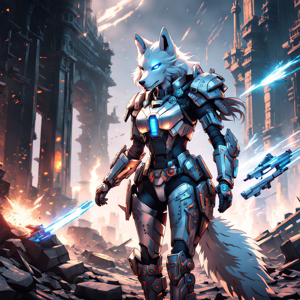 A powerful anthropomorphic wolf warrior standing on a ravaged battlefield. She wears form-fitting mech armor with glowing blue accents, accentuating her feminine figure in a cyberpunk aesthetic.