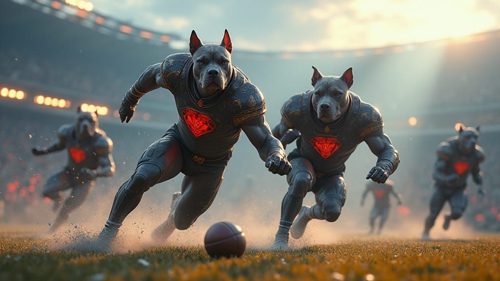 Hyper-realistic anthropomorphic pit bulls playing American football in a fantasy stadium, muscular bodies in dynamic motion, clad in mystical armor-like jerseys with glowing runes, dramatic composition in the middle of the frame, volumetric lighting piercing through crystalline clouds, splatter art style ...