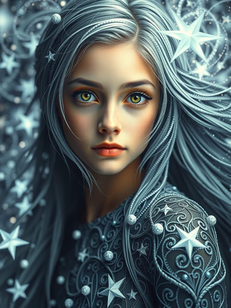 A captivating image of a woman with Zentangle-patterned hair surrounded by swirling silver stars. Her dress is made of tangled lines. The portrait features Rembrandt lighting and vibrant, intricate details in a surreal art style.
