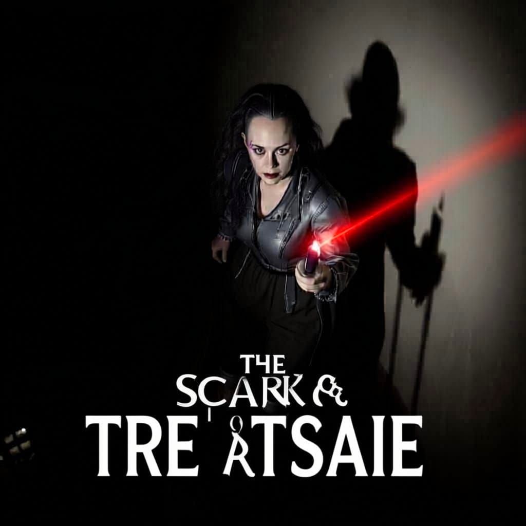 This image shows a woman with a candle descending a spiral staircase. Long shadows create a dramatic contrast. Her vintage clothing and frightened expression add to the scene's tension.