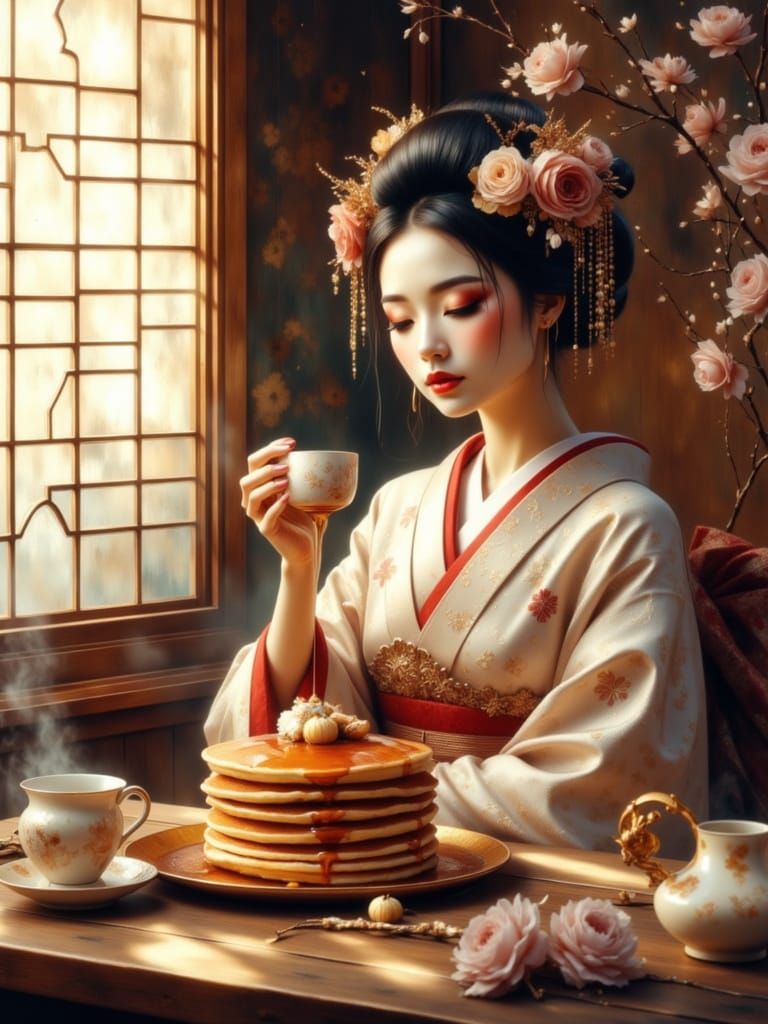Easily generate unique images of geishas enjoying pancakes and tea with our free AI tool. Unleash your creativity!