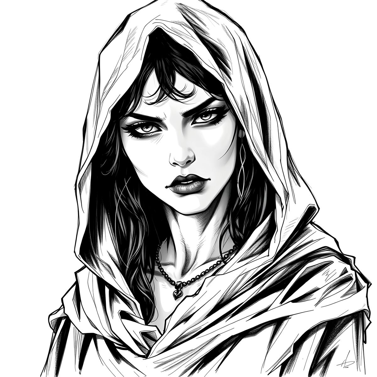 This image depicts a medieval woman in a Gothic sketch style. The dark art piece features a black and white palette, dark eyes, and a veil over her face.