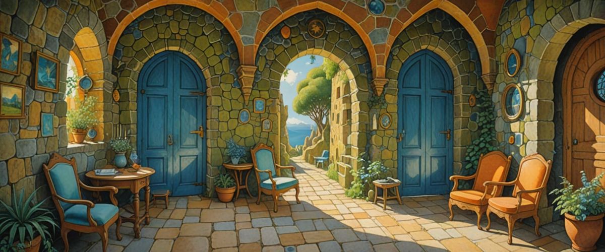 A cheerful image of mysterious passageways with colorful stone walls, arches, chairs, and doorways. The scene is rendered with bright, cheerful colors and volumetric lighting in a whimsical style.