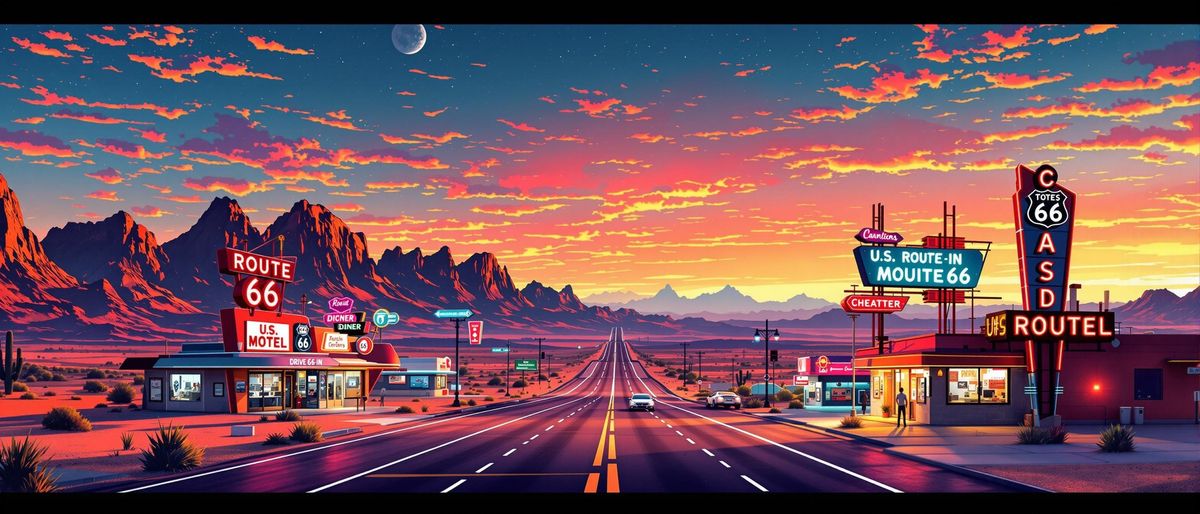 This image shows a desert landscape featuring U.S. Route 66 at sunset. Atomic age architecture, neon lights, and nostalgic typography evoke a sense of wonder in a retro-futuristic style.