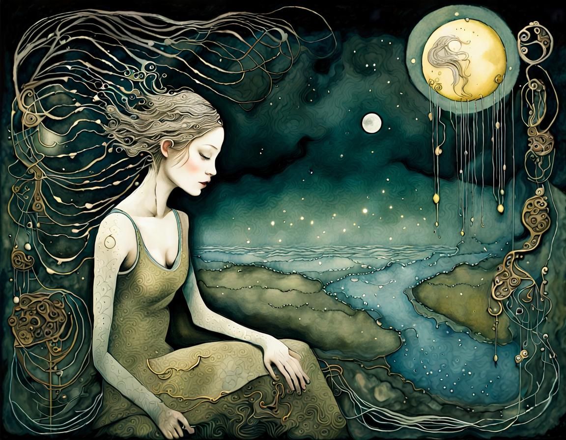 nucleotidescape claymation textile art image of a woman, dave mckean ink drips, by dave mckean, bioluminescent, by Dave McKean, dave mckean stina persson, david choe, various artworks, wires, inspired by Dave McKean, portrait , esao andrews, dave mckean, multi-layered artworks, cells, music notes, ...