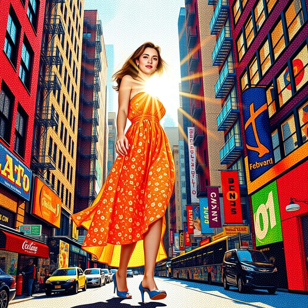 A young woman steps into a dynamic city, surrounded by intricate pointillism details and warm sunshine rays, in a modern, kinetic art style that echoes the works of master pointillists.
