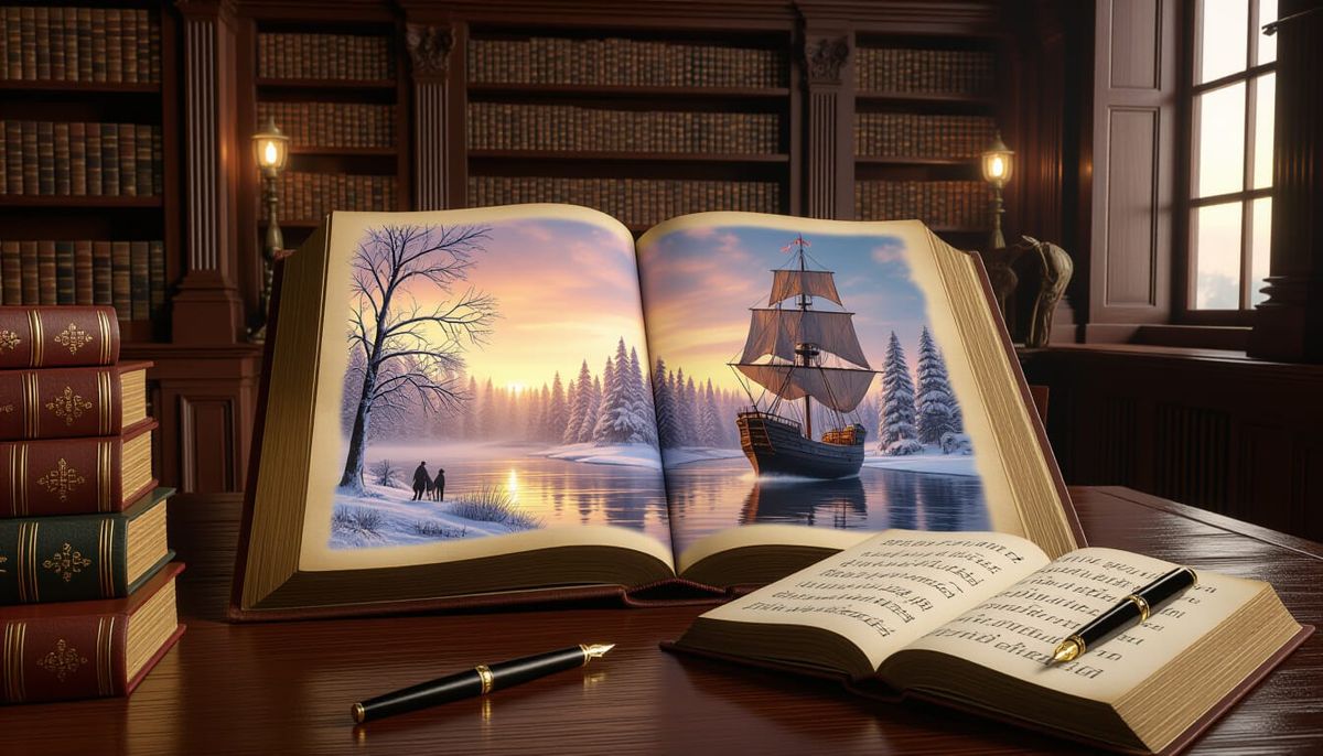 A hyper-realistic digital painting of a cozy, antique library. An ancient book transforms into a fantasy landscape, blending winter forests and sailing adventures with cinematic lighting.